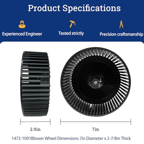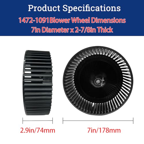 Replacement part number: Upgraded 1472-1091 blower wheel, compatible with air conditioner models 4800, 4801, 4805, 4806, 4820, 4821, 4825, 4826, 6701-6703, 6721-6723, 6731-6736, 6741-6747, 6749, 6757, 6759, 6767, 6769, 6770, 6777, 6779, 8332, 8333, 8335, 8373, 8433, 8473, 8533-8535, 8632, 8633.Check the manual or replacement parts diagram for specific part information before ordering to ensure compatibility