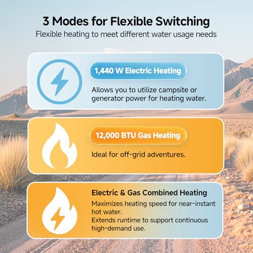 FASTER RECOVERY WITH DUAL-FUEL VERSATILITY: Enjoy quicker hot water regeneration! Use efficient PROPANE for off-grid freedom, switch to 120V ELECTRIC at full-hookup sites to save propane, or activate BOTH MODES simultaneously to rapidly reheat your 10-Gallon tank – significantly reducing wait times between uses.