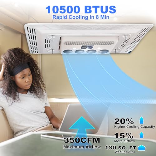 Rooftop AC unit for yearlong enjoyment: 10,500 BTUs of high cooling capacity and 350 CFMs of powerful airflow cover a large space of up to 130 square feet. Connect to car battery or external power source, save up to $6,000 per year in fuel costs.