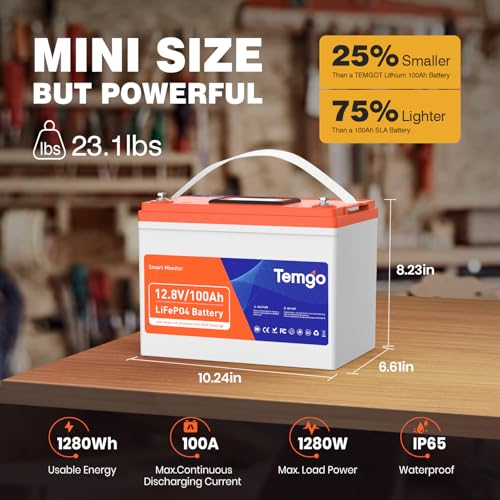 ?Group 24 Smaller Size But Poweful?TEMGOT 12V 100ah group 24 self-heating lithium battery is 25% smaller than before, but provide the same power (1280Wh energy). Engineered with Lithium Iron Phosphate (LiFePO4) technology made this battery has half the weight (23.14 lbs). And lasts 5 times longer than a lead acid battery, it is a perfect upgrade for any 12V deep cycle battery.