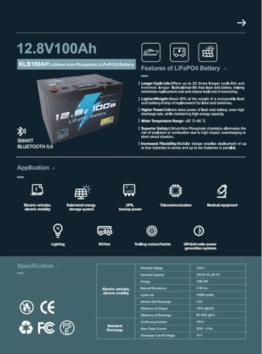 ?Smart Bluetooth5.0 Control? Equipped with Bluetooth 5.0, this battery enables real-time monitoring via an app, allowing users to track voltage, current, temperature, and capacity. This feature optimizes energy usage, particularly in solar panels and off-grid systems. The 12 volt 100Ah LiFePO4 battery can be used to build a 48V 400Ah system, providing up to 20.48kWh of energy and 20.48kW of load power. It is perfect for RVs, solar setups, home energy storage, and especially for 30-70 lb thrust trolling motors.