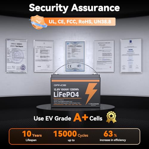 Reliable & Safe Battery: GRNOE 12V lithium battery adopts advanced A+ grade LifePO4 cells and is UL/UN38.3 certified, with higher energy density and more stable performance. The internal structure is optimized and new structural components are used to make the battery more compact, improve the high performance of the battery and ensure safety.