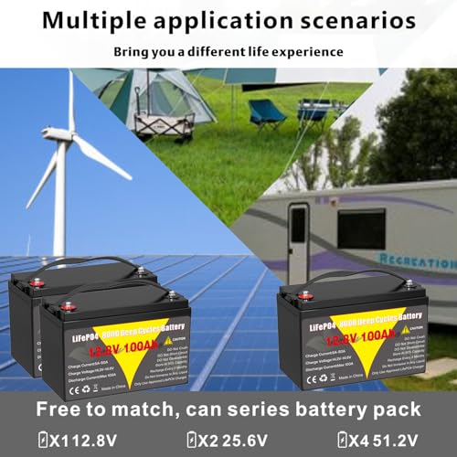 ?Connections for Higher Capacity? 12V 100Ah LiFePO4 batteries can be connected in parallel or series for greater capacity. Expansion to 4S or 4P is allowed to obtain a maximum capacity of 400Ah or a maximum voltage of 48V(51.2V).12V 100Ah LiFePO4 lithium batteries have a wide range of uses for RVs, backup power, home solar off-grid systems, lighting. 12.8V 100Ah mini version battery is suitable for 30-70 lbs trolling motor.