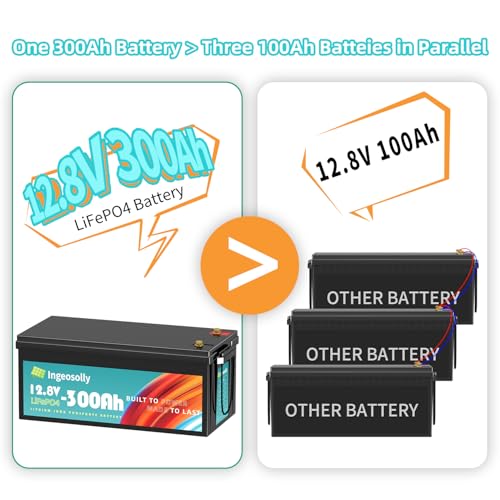 ?Grade-A Cells and Smart BMS? Ingeosolly insists on using Automotive quality LiFePO4 cells across its lithium battery portfolio, and the battery is protected from over charging, over discharging, over current, overheating, and short circuiting by a powerful BMS.12V 300AH lithium batteries is suitable for energy storage and not for starting, Maximum discharge current is 1 C. Our lithium batteries 12v 300ah not only offer you enough energy, but also take up less space and greatly reduce loads on device