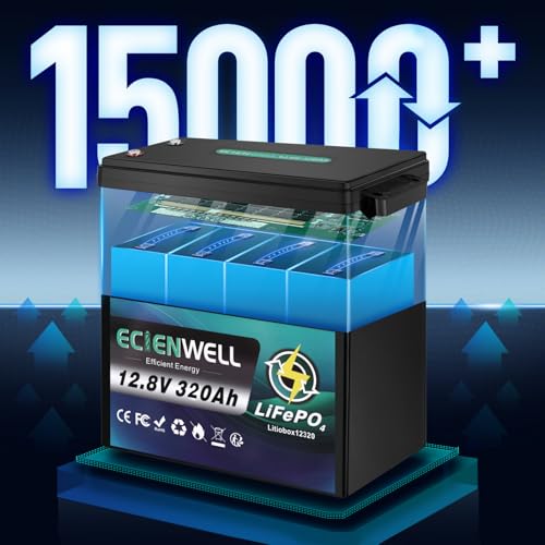 ?12v 320Ah Automotive Grade Lithium Battery?The ECIENWELL 12V 300Ah+ LiFePO4 battery features an automotive Grade battery that delivers 4096Wh of energy output and has a higher energy density. Our deep cycle marine battery contains 4000+ cycles @100% DOD (6000 cycles @80% DOD, 15000 cycles @60% DOD). IP65 waterproof ensures you to use lithium batteries anywhere safely.