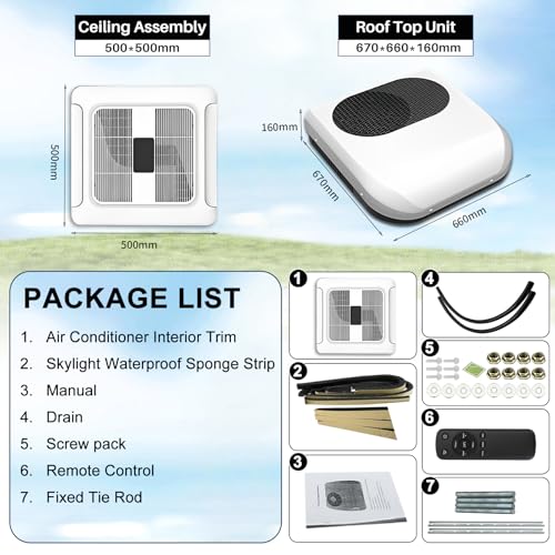 ?????Inverter Cooling & Low-noise Tech?Our inverter RV air conditoner will adjusts its operating frequency to the environment, thus reducing energy consumption. The a/c unit is equipped with a household-type ultra-quiet evaporator, intelligent temperature control, and operation below 45dB to create a comfortable space.