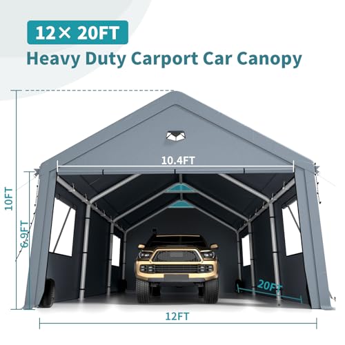 ?Great Value?: Our 12x20 carport offers excellent value for money with our high-quality materials, versatile design, and rich freebies. In addition to the carport itself, your purchase includes a free set of solar lights, a light belt, bindings and windproof weighted sandbags, making it a complete package that provides even more value for your money.