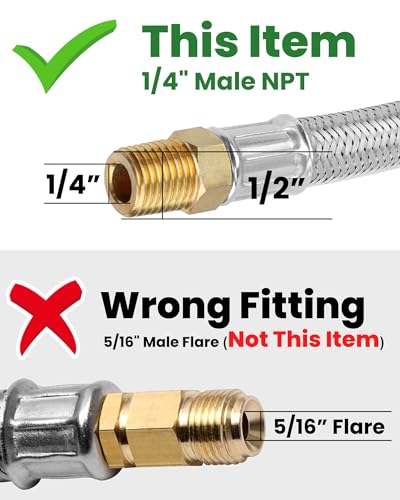 Important Fittings Check —— RV Propane Hose's Fitting: 1/4" Male NPT ( Not 5/16" Inverted Flare) & QCC Type 1. Length: 15 inch. (Tips: Please check the Fitting and Length carefully before ordering the rv gas hose.)