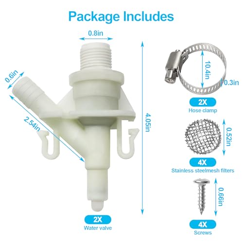 All-In-One Kit with Essential Parts: The kit contains all necessary parts to get your valve working properly. Package Includes 1 x water valve, 1 x hose clamp, 2 x screws and 2 x stainless steel mesh filters (for future maintenance use). For spare needs, we also offer 2 Pack sets.