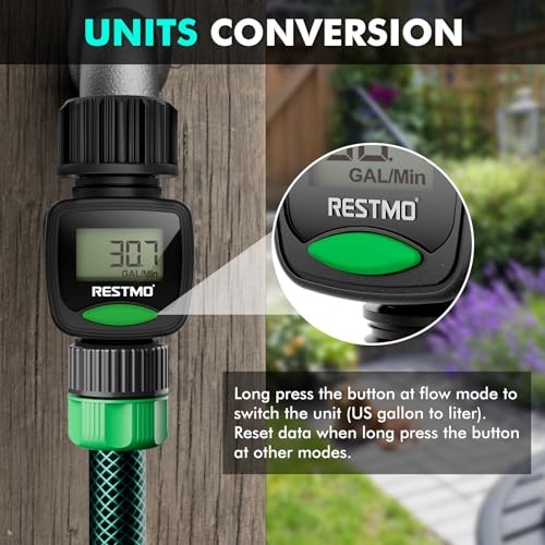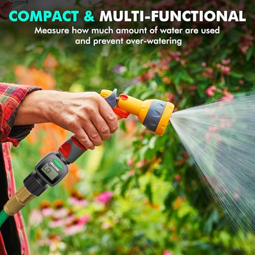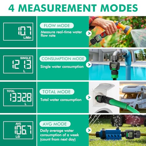 Equipped with an easy-to-read LCD screen and one-touch control push button, this water flow meter can easily display and track the water usage & flow rate of your outdoor garden hose with 4 different measurement modes.