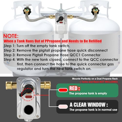 ??Upgraded Quick Connect 2-Stage Auto Changeover LP Propane Gas Regulator?This Rv Propane Regulator allow you to hook up 2 Propane tanks and automatically switches from primary to reserve tank when primary is empty and vice versa. The indicator will changes color to let you know when a tank has been depleted and need to be refilled also remind you switching to the backup tank. For RVs with dual propane tanks allow removal of empty cylinder for non-stop refill without interrupting propane supply