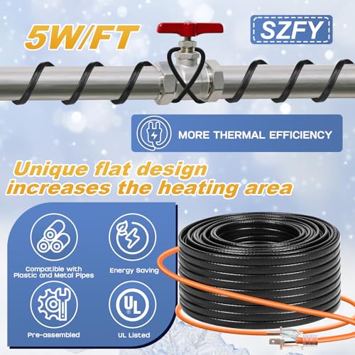 ?Ultra-high Heating Efficiency?: The heat tape can withstand -40°F cold weather. Unlike ordinary heating tapes on the market, after thousands of experiments by a team of doctoral researchers in a German laboratory, the factory finally chose 11W/FT. The addition of a thickened copper wire core brings dual benefits of heating efficiency and energy-saving experience, which is the most important reason why customers have chosen SZFY over the years.