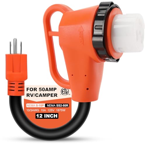50 Amp to 15 Amp RV Adapter - 15A (NEMA 5-15P) male to 50A (NEMA SS2-50R) female heavy duty rv power adapter. Rated for 125V and 1875W.
