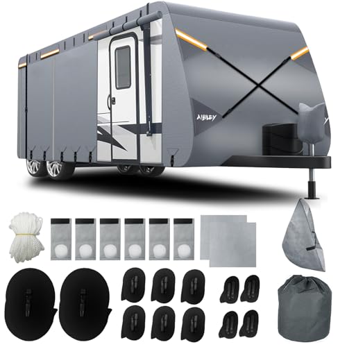 Excellent windproof & Fit- The camper cover has 2 extra-long body windproof buckle straps and 4 windproof buckle straps on 2 sides,and then have 2 windproof straps at front and back of rv,Their design evenly distributes wind force to avoid damage to the cover and RV structure. and The bottom have a securing rope to prevent it from being lifted,moved or blown away by strong winds,keeping it in place. The windproof buckle straps also prevent rain,dust get into rveffectively safeguarding the RV