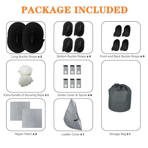 Package Included- body windproof fixed buckle straps x2,extra bundle of white securing rope x1,repair patch x2,bottom windproof fixed buckle straps x 4,gutter cover & sponge x 4,ladder cover x1,front and back windproof fixed buckle straps x4,storage bag x1