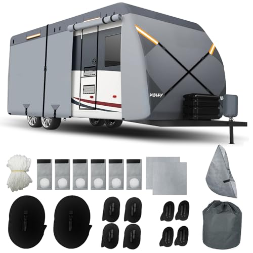 Great UV-proof and Waterproof Performance- Our travel trailer cover is made of an advanced anti-ultraviolet material.It can maintain a stable protective performance for a long time,preventing damage to the rv's paint,interior,tires and other components caused by long-term exposure to the sun,such as fading,aging and deterioration,ensuring that your rv remains intact under any harsh sunlight conditions.It is not only waterproof but also water-repellent.Rainwater will bead up readily and slide off the cover, ensuring that the interior of the RV remains dry