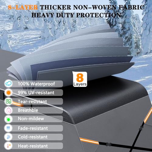 Durable and Tear-Resistant Fabric- The RV cover is constructed from a robust 8-layers non-woven fabric. The sides are composed of 105g multi-layer non-woven fabric,while the top utilizes a 160g multi-layers non-woven fabric with a thickening design. This combination enhances the cover's resistance to wind, water, and tearing under adverse conditions while safeguarding against scratches caused by branches, wet leaves, and bird droppings