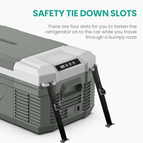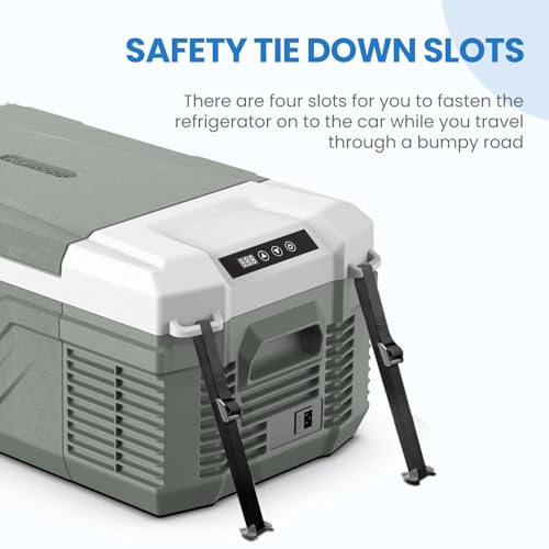 HUMANIZED DESIGNED: Alpicool 12 volt refrigerator comes with practical features, including durable latch and sturdy handle for easy opening and lifting, tie down slots allowing you to use straps to fasten the refrigerator to the seat or trunk, enhancing stability while on the road trips. These thoughtful designs ensure a stable operation of the refrigerator in various scenarios.