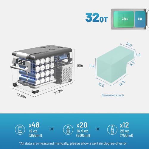 STORAGE SPACE:Exterior Size 27.2”x13.6”x15”, 32Quart(30.6 Liter) capacity ,fits 48 x 12ozs cans of Cola.