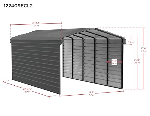 DIMENSIONS: The fully assembled Arrow Sheds steel carport measures 146" W x 290.75" D x 126.75" H, or 12' W x 24' D x 9' H; this unit contains 12 packages: 4 frame cartons, 2 roof panel cartons, and 6 enclosure panel cartons