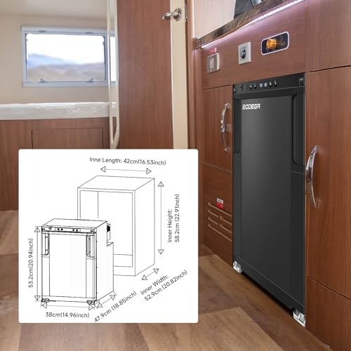 Dual Zone & APP Control : BODEGA 12 Volt RV refrigerator supports manual control or WiFi APP control (For android & ios). Dual zones allow for both freezing and refrigeration, with the upper zone serving as the freezer and the lower zone as the refrigerator. You can check or set the temperature, voltage, cooling mode and more using the APP