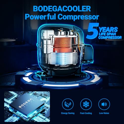Battery Protection & Energy Saving: BODEGACOOLER 12v cooler has H/M/L battery protection levels, which prevent overloading or short-circuiting of your car's power supply, you needn't worry about running out of car power when using this electric cooler. ECO energy-saving mode that promotes low energy consumption. Even when running on MAX mode, this car freezer consumes less than 1 kWh/day due to its efficient cycle work.