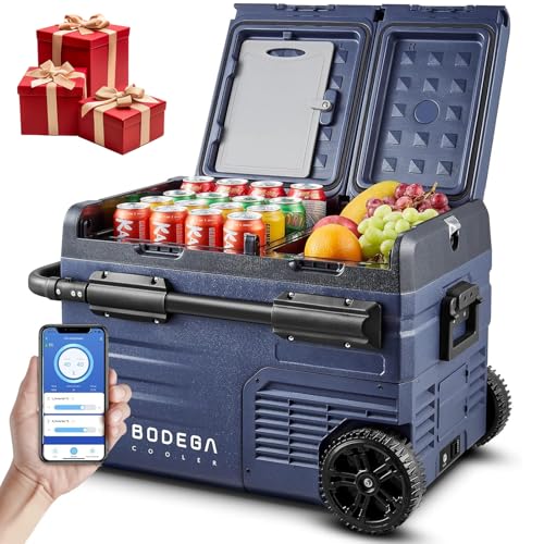 ?User Frendly Design?The door of BODEGA car refrigerator can be removed at will to change the opening method according to your needs/scenario/habit, making it more convenient for you to get food and drinks while driving; and our refrigerator comes with superior off-road wheels(non-slip) and solid extendable handle, making it more convenient to carry when you go on picnics and excursions.Our portable car refrigerator allows you to enjoy cold drinks