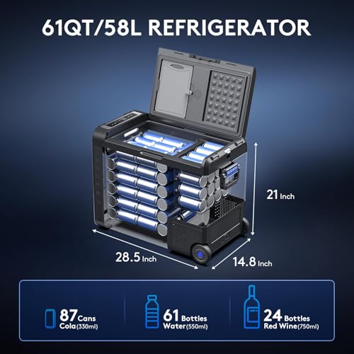 Dual Compartment & Power Capacity: BODEGACOOLER car refrigerator has two compartments, you can adjust the temperature of the larger zone from 68 °F to -4 °F. The temperature of the smaller zone is influenced by the larger compartment and cannot be adjusted independently. The 47L larger zone+11L smaller zone=58L. This RV fridge can be both a refrigerator and a freezer for truck drivers, boat owners and campers to store essentials like seafood, snacks, meat, and beverages