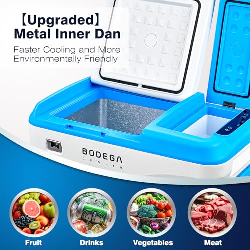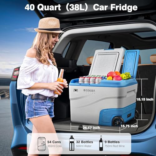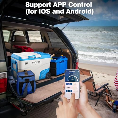 DUAL ZONE AND APP CONTROL CAR FRIDGE:BODEGACOOLER 12Volt refrigerator is equipped with two zone,the two zones can be independently controlled for temperature 38L(40 Quart). Our car refrigerator support App control.(For android and ios)