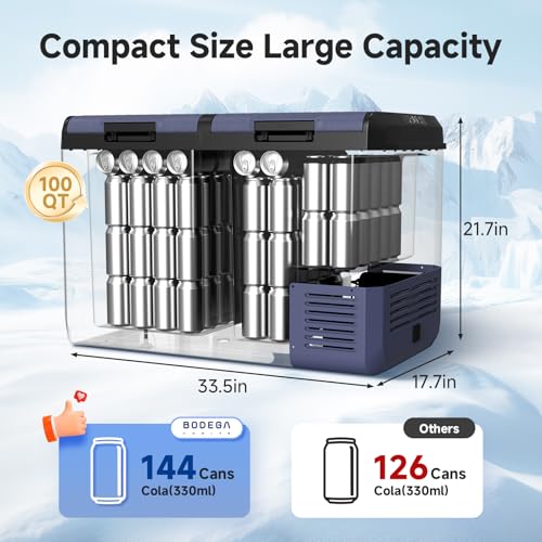 ?DUAL ZONE LARGE CAR FREEZER?BODEGACOOLER car refrigerator Left zone 52.5L (56 Quart) + Right zone 42.5L (44 Quart) = 95L (100 Quart). You could control the temperature of dual zone independent. You could place meat, vegetable, drink and the other needs cold. BODEGACOOLER car refrigerator is best choice for camping, party, outdoor and travel.