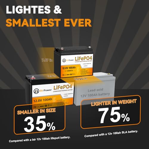?Only 19lbs with Same 1280Wh Energy?BtrPower 12V 100Ah MINI LiFePO4 battery weighs only 19lbs,,Exquisite technology makes the 12V 100Ah size mini enough but powerful as usual (100% 1280Wh energy storage).it is only 1/3 weight of the 12V 100Ah lead acid battery at the same energy of 1280Wh, perfect replacement for the agm battery, much easier for you to move or carry on your trip.