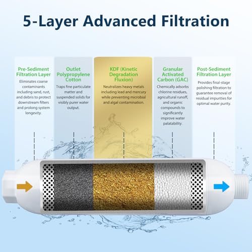 5-Layer Advanced Filtration: Features a 5-layer filtration system (20-micron rating) with granular activated carbon (GAC) and kinetic degradation flux (KDF) technology. Inline water filter reduces odors, chlorine, rust, sand, debris, visible suspended solids, large particles, and heavy metals in drinking water