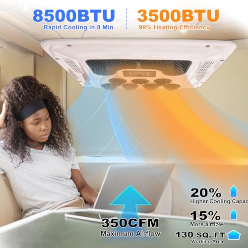 ?????ROOF AC HEATER COMBO FOR YEARLONG ENJOYMENT?Whether you're battling the heat or want to stay warm in the winter, a 12V DC camper air conditioner not only cools your RV, but also heats it. The high cooling capacity of 8,500 BTUs and powerful heating capacity of 3,500 BTUs can cover a larger space of up to 130 square feet. With electric power, expect to save up to $6,000 per year in fuel costs.