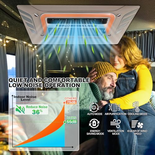 ?????Inverter Cooling & Low-noise Tech?Our inverter RV air conditoner will adjusts its operating frequency to the environment, thus reducing energy consumption. The a/c unit is equipped with a household-type ultra-quiet evaporator, intelligent temperature control, and operation below 45dB to create a comfortable space.