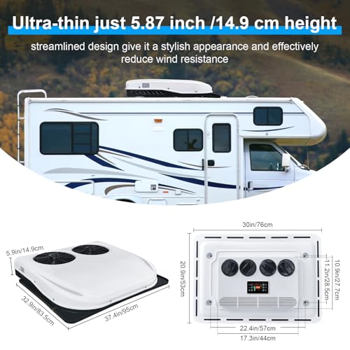 1. Wide compatibility: This Large Vehicle RV roof air conditioner is suitable for most RVs, light trucks, vans, sedans, agricultural vehicles, construction machinery, etc. It is more compatible, easy to install, and provides an ideal air conditioning solution for your RV. The size of the RV air conditioner is 37.4 inches * 32.87 inches * 5.87 inches. The size of the sunroof needs to be greater than 19.18 inches * 11.25 inches and less than 21.26 inches * 11.25 inches. Kind reminder: Please check the size of the sunroof before purchasing to avoid unnecessary losses.