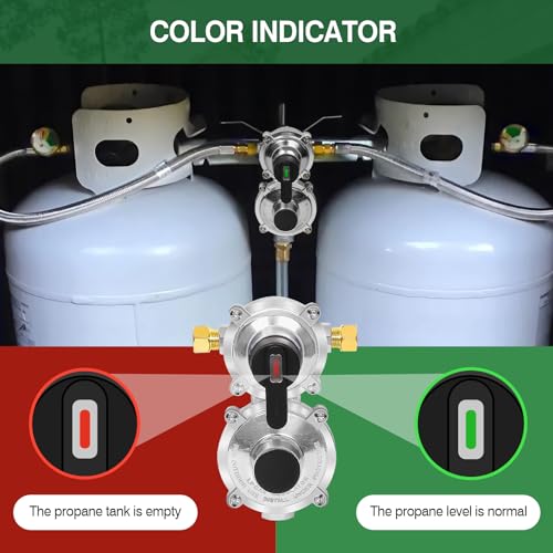 RV Propane 2-stage Regulator: The dual propane regulator is equipped with two inlet ports for connecting to separate 2 propane tanks, seamlessly switching between them. When one cylinder is low, it auto changeover to the other full bottle for uninterrupted propane gas supply to appliances, but also allowing removal of empty cylinder for refilling. Additionally, 2-stage automatic changeover lp propane gas regulator come with a color indicator that informs you about the propane level in the tank