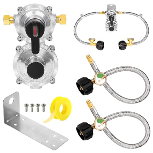 100% Satisfaction & Package List:If for any station you find with our products after received within 1 years. Our Customer Service will solve your problems within 24 Hours. Package includes: 1pcs 2 Stage Auto Changeover RV Propane Regulator + 2pcs 12'' Stainless Steel Braided RV Pigtail Propane Hoses with Gauge + 1pcs Roll Sealing Tape + 1pcs Wrench + 1pcs Regulator Brackets and screws