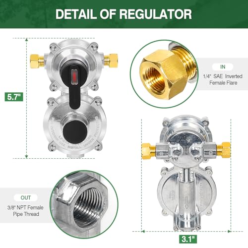 Specification & Parameters: This rv propane 2-stage auto changeover lp propane gas regulator has a master cylinder capacity of 210,000 BTU/hour and a reserve cylinder capacity of 130,000 BTU/hour, ensuring continuous propane supply. Crafted with solid brass, the inlets have 1/4" SAE inverted female flare, and the outlet features a 3/8" NPT female pipe thread. Safety is a top priority, with manual control and excess flow protection for enhanced reliability
