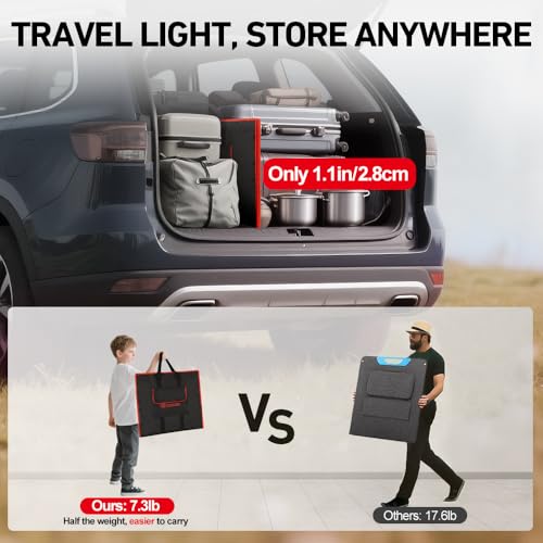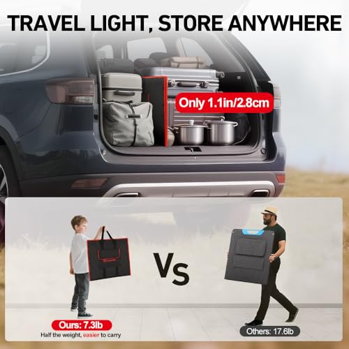 ?FOLDABLE AND LIGHTWEIGHT EASY TO STORE?-- This solar panel photovoltaic packs 160W of power yet is only 1.1inch(2.8cm )thick and weighs only 7.28lb(3.3kg), making it easier to mount,transport, hang, and remove.