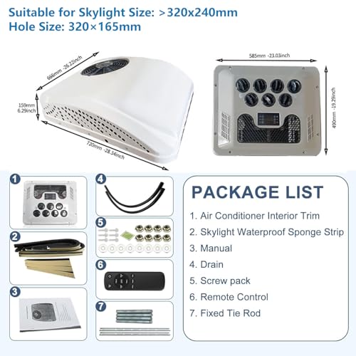 3?? ?Simple Installation with All-In-One Design?The rooftop air conditioner easily installs on vehicles with a skylight size of 11.8×6.7in (300×170mm) or larger. Non-sunroof vehicles can still install by opening the window to fit. Fast and straightforward installation for long-lasting comfort.