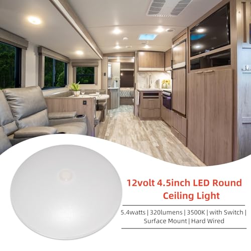 ?12v RV Light?This light embraces the concept of simplicity and low burden. Item dimension: 4.5"L x 4.5"W x 0.8"H. Designed for 12volt DC low voltage automatic vehicles, like RV, travel trailer, campervan, coach, boat.