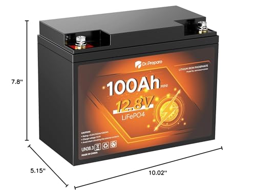?Mini Size, Powerful Energy? Each 12V 100Ah mini LiFePO4 battery dimension is 10.02*5.15*7.8inches (only 0.23ft³) and 22lbs, which is about 50% size of our 12V 100Ah LiFePO4 battery and 30% weight of a 12V 100Ah SLA battery, while supports the same energy of 1280Wh and 100% discharge. This mini Lithium battery is more compact and space-saving with 1.9 times energy density higher than other LiFePO4 batteries.