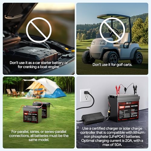 ?Series and Parallel Connection?With 12V 100Ah Mini LiFePO4 Batteries, whether creating a 24V 100Ah lithium battery bank or a 12V 200Ah power system, our MINI LiFePO4 batteries are both supported. You can even wire up to 16 batteries in series and parallel to build a powerful home battery bank system with a power of 20.48 kWh. Kindly note that each battery have to be full charged separately by 12V lithium charger before series, not delivering too much voltage to other batteries.