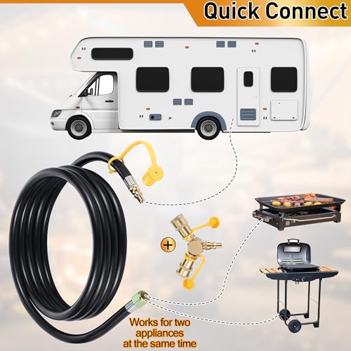 Convenient Package: this RV propane quick connect set comes with 2 pcs 12 feet RV propane hose, 1 pcs 1/4'' propane quick connector, more convenient when you have more than one item to hook up to propane; Works great for using RV propane fire pit, compatible with Blackstone griddle