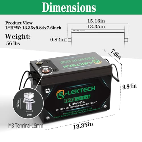 LIGHTWEIGHT & PORTABLE: Product size: Length 13.35* Width 7.6* Height 9.84 inches. The E-LekTech 12V 330Ah LiFePO4 battery weighs just 56 pounds, half the weight of a lead-acid battery, and has twice the capacity of a lead-acid battery, making it easy to move and install. Our 330Ah LiFePO4 batteries provide 100% of the available capacity compared to lead-acid batteries. Both indoor and outdoor, easy to carry.
