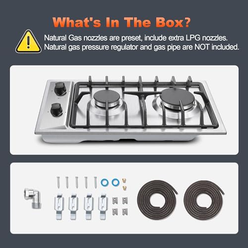 Gas Cooktop 2 Burners: Features two sealed burners of different power, burner power is 5,000-BTU and 10,500-BTU, can be adjusted individually, meet various cooking needs. This 2 burner propane stove is preinstalled for NG, extra LPG Nozzles included, can be changed to meet your needs.