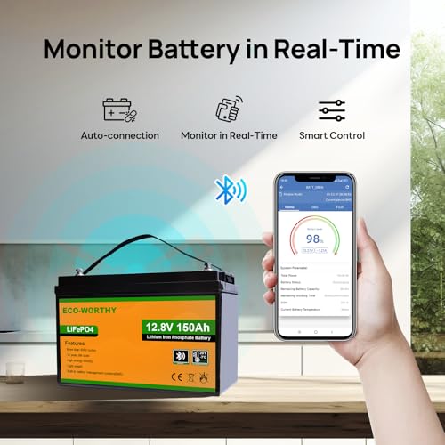 [Bluetooth Real-Time Monitoring] Meet new ECO-WORTHY 12V 150Ah LiFePO4 battery featuring Bluetooth 5.0. Now you can check the status of battery voltage, current and capacity at any time from your phone. Also you'll be able to keep a close eye on the battery remaining working life. Stay confident and focused on every fishing trip without worrying about unexpected power loss