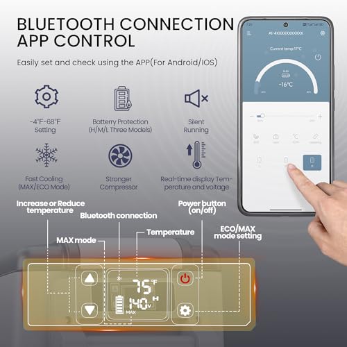 High Efficiency & Low Consumption: The EKOJUCE 12V fridge is equipped with a powerful compressor and an efficient condensing tube design, making the overall cooling efficiency very high. You can adjust the temperature between -4? and 68?. The Electric Cooler has MAX/ECO mode, allowing you to choose between MAX fast cooling and ECO energy-saving mode according to your needs