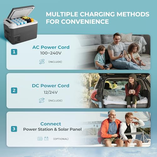 Battery protection and multiple power sources: This camping fridge offers 3 level battery protection, allowing you to adjust the input power between L/M/H modes to prevent overload or vehicle battery drain. The 12v fridge can be powered by both DC and AC, suitable for a variety of scenarios.