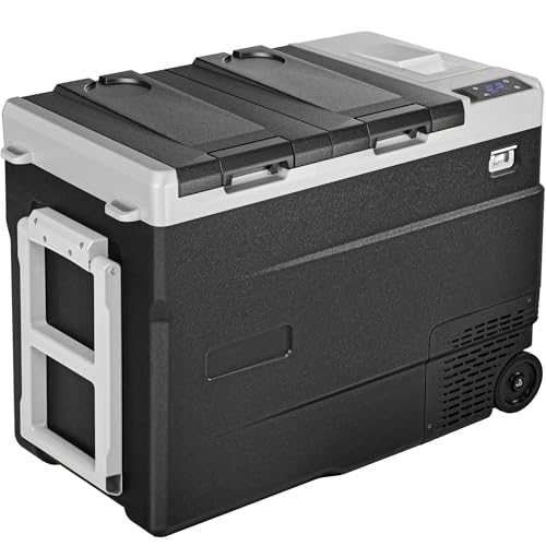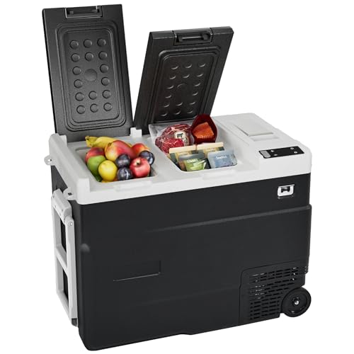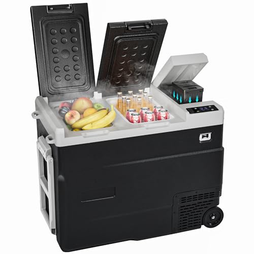 Dual Zone & Portable design:This 49QT car cooler is equipped with two storage areas and has two separate doors, which can be used as a refrigerator freezer separately. The 12v fridge is equipped with a pull rod and wheels, allowing you to move it easily. The anti-vibration and anti-bumping design allows the portable refrigerator to operate stably on a 40° slope.